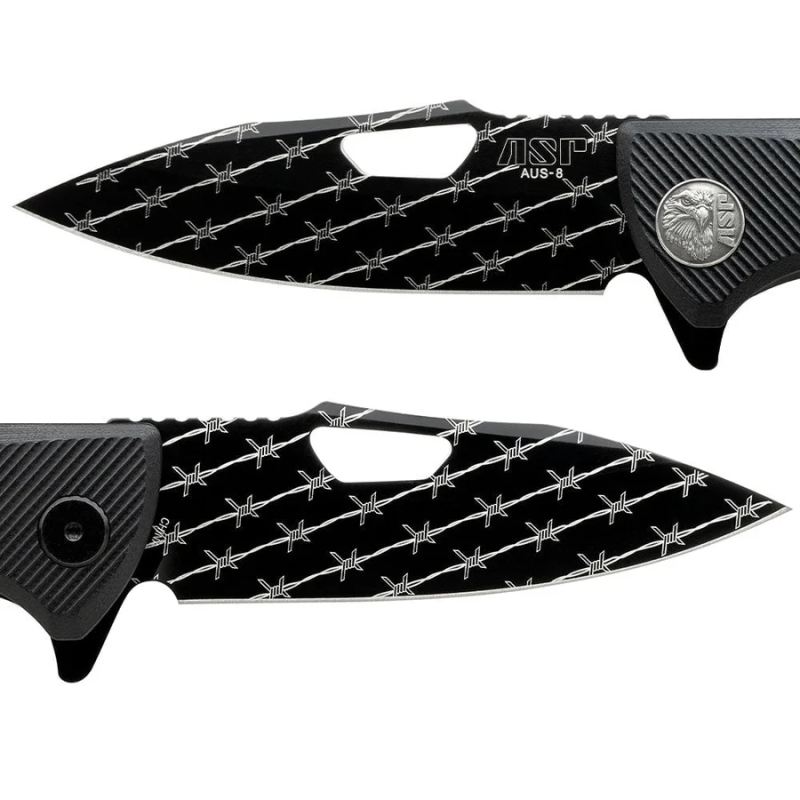 The PDK series of knives is the result of collaboration between law enforcement officers, ASP's product designers and knife engineering and manufacturing experts. Their goal was to create a practical, tough and dependable knife specifically for day-in, day-out police use. A tool of excellent quality, yet affordable for any officer. The Engraver's Edition series features five exclusive embellishments, applied to the black blades of our original flat grip, Classic Folder PDK. The designs were created by our master engraver, and meticulously crafted in our state of the art, in-house laser engraving facility. The PDK features a 3.5†drop point “flipper†blade design with fast, positive assisted opening. The blade is crafted of highly corrosion-resistant, easy to maintain AUS-8 stainless steel. A liner lock makes it safe and easy to release and close the knife. High-quality, textured G-10 scales (grip panels) provide a sure grip, and our signature Shark Fin jimping adds solid control. PDK knives feature our unique, quick-release pocket clip system. Reversing the clip for right- or left-pocket carry is as fast and simple as using the double lock pin on a handcuff key (not included) to release the clip lock, and snapping it into the slot on the other side. No tiny screws to use (or lose). Finishing touches include a Thin Blue Line tribute spacer in the spine of the knife, and a die struck ASP Eagle medallion mounted in the grip.