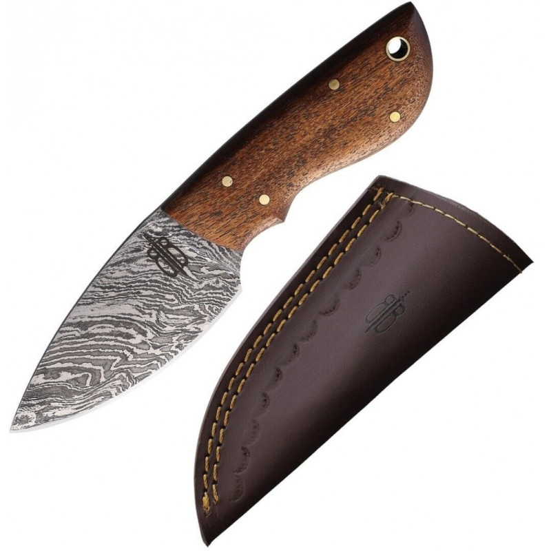 This small skinner has a 1095 Damascus blade with full tang construction. Blade is 1/8 thick and 1 1/4 deep. Gorgeous Walnut Wood Handle scales with four brass pins