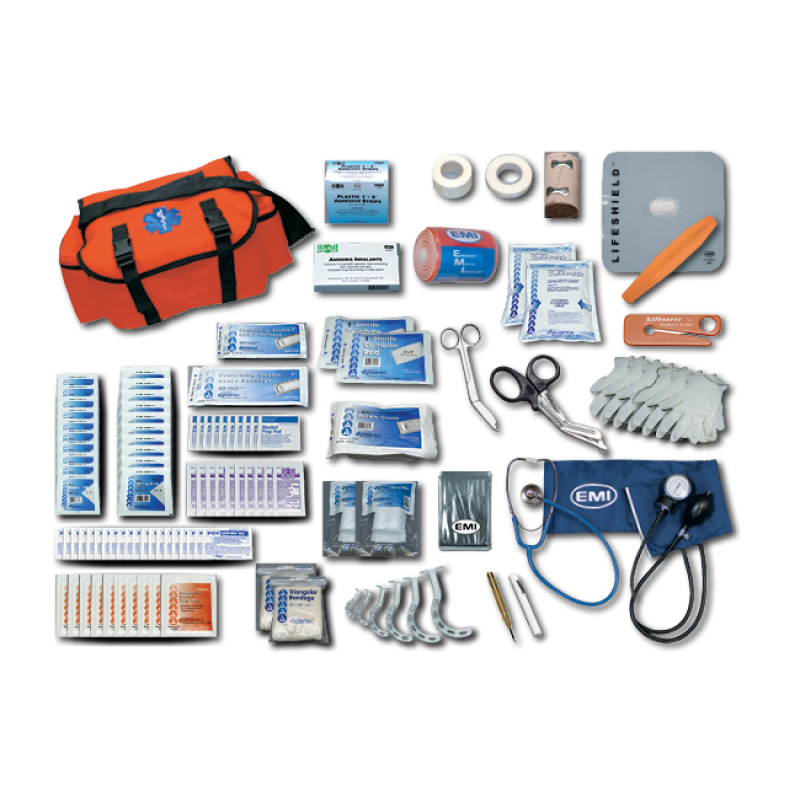 EMI's Pro Response Complete contains an assortment of basic life support components for first-on-the-scene personnel. The Pro Response Bag features easy access, durability and storage. The top flap has delrin buckles for quick access. A 3 section main compartment, 2 wing pouches and a dual front pocket with hook and loop closures complete the bag. The Pro Response bag also comes with a rifle sling strap and a reflective star of life. Includes: 2 - Triangular Bandages 1 - 1/2' Adhesive Tape 1 - 1' Adhesive Tape 1 - 3' Sterile Conforming Bandage 1 - 4' Sterile Conforming Bandage 1 - 4 1/2 Krinkle Gauze Roll 10 - 3' x 3' Sterile Pads 10 - 4' x 4' Sterile Pads 2 - 5' x 9' Abdominal Pads 50 - 1' x 3' Adhesive Bandages 1 - 3' Elastic Bandage 2 - Burn/Blood Stopper Bandages 1 - Disposable Airway Kit 1 - CPR Lifeshield 1 - Plastic Bite Stick 10 - Alcohol Prep Pads 2 - Instant Ice Packs (5' x 9') 20 - Antimicrobial Hand Wipes 10 - Triple Antibiotic Ointment 10 - Povidone Prep Pads 1 - Box Ammonia Inhalants 1 - Thermal Rescue Blanket 6 - Latex Gloves 1 - Adult Nylon Blood Pressure Cuff 1 - Dual Head Stethoscope 1 - EMI Splint 1 - Instrument Pack (5 1/2' Bandage Scissor, Deluxe Shears, Penlight, Window Punch, Lifesaver Seat Belt Cutter)