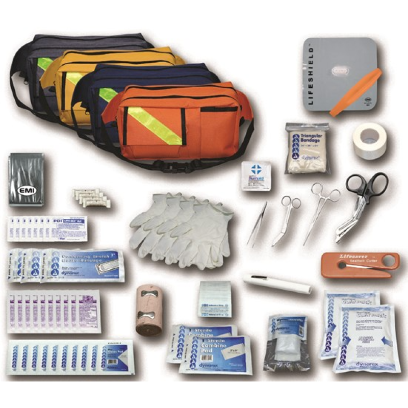 Trauma Pac kits offer the essential basic life support components for the first responder. Trauma Pac features EMI's fanny packs. These packs have three outside pockets for instruments, seat belt cutter, gloves, etc. Two large zippered inside pockets can easily hold all supplies and equipment. The adjustable nylon webbing can fit 20' to 54' waists and has a quick-release buckle. Includes: BANDAGES AND DRESSINGS 1 - Triangular Bandage 1 - 1' Adhesive Tape 3 - 3' Sterile Conforming Bandages 8 - 4' x 4' Sterile Pads 2 - 5' x 9' Abdominal Pads 25 - 1' x 3' Adhesive Bandages 1 - 3 Elastic Bandage 1 - Burn/Blood Stopper Bandage AIRWAY MANAGEMENT 1 - CPR Lifeshield 1 - Plastic Bite Stic EMS SUPPLIES 2 - Instant Ice Packs (5' x 9') 8 - Antimicrobial Hand Wipes 10 - Triple Antibiotic Ointments 4 - Ammonia Inhalants EMS EQUIPMENT 1 - Thermal Rescue Blanket 4 - Latex Gloves 1 - Instrument Pack (4 1/2' Splinter Forcep, 5 1/2' Bandage Scissor, 5 1/2' St. Kelly Forcep, Deluxe Shears, Penlight, Lifesaver Seat Belt Cutter)