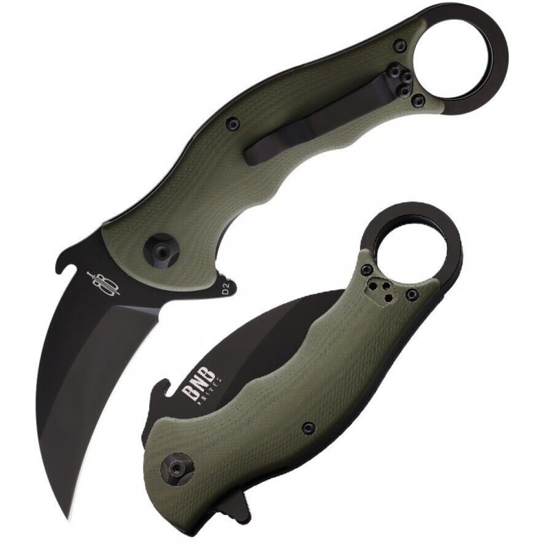 This awesome new Karambit Folding knife from BnB Knives comes in an army green or tactical black handle with finger ring and a black finished D2 tool steel hawkbill blade. The tactical black blade is outfitted with liner lock opening mechanism and a smooth flipper action. The Karambit handle has steel liners, lock tab and a tip-up carry pocket clip