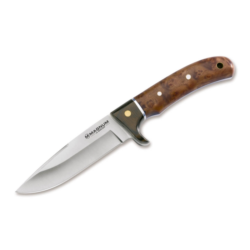 The Magnum Elk Hunter impresses with its ideal blade length. Optics and function characterize the shapely Knife with stainless 440A blade. The handle is made of tropical Rosewood, which has a very smooth surface thanks to its fine pores in the processed state. The lanyard hole allows a cord or a lanyard to be attached to the knife. With high quality leather sheath.