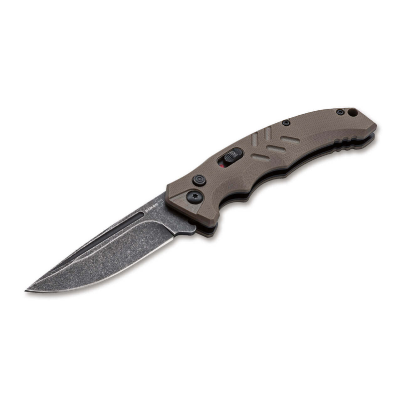 The Boker Plus Intention was designed as a versatile tactical knife that can easily handle your everyday cutting tasks. The D2 blade swings open at the push of a button by means of the tensioned spring behind it, and is secured with a sliding lock to prevent accidental opening or closing. The ergonomically shaped handle is made from textured G10, with a fluted thumb rest and deep finger choil for a secure hand position. With a lanyard hole and pocket clip