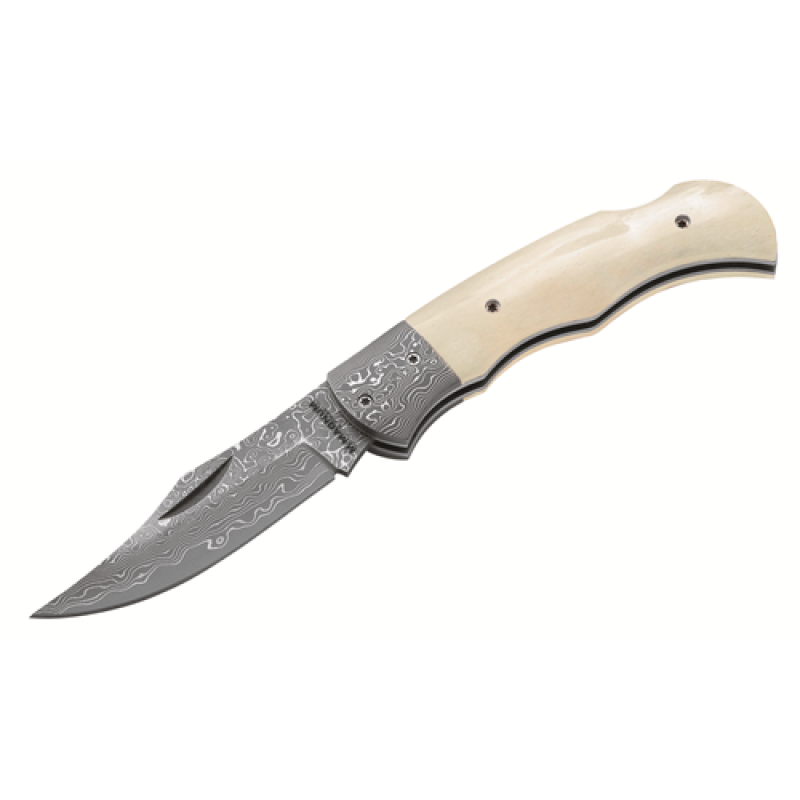 The Magnum Damascus Bone is a magnificent Damascus Pocket Knife featuring a finely drawn Damascus blade and Damascus bolsters. The scales are made of polished bones which results in a beautiful contrast to the darker Damascus steel. The blade is locked by a classic backlock.