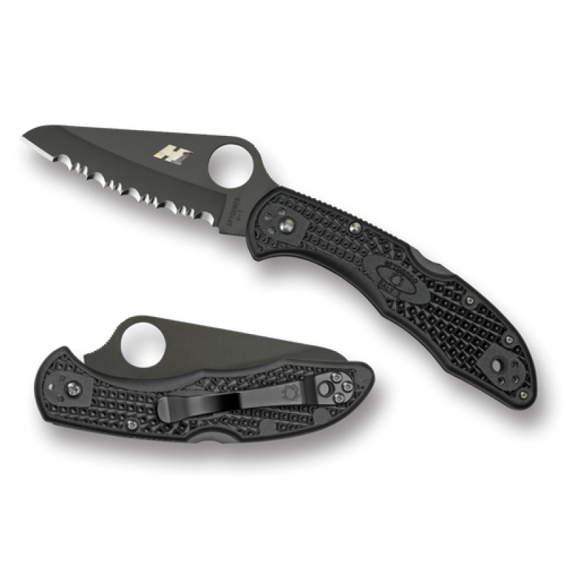 The Salt 2 Black Blade features a hollow-ground H-1 blade cloaked in a non-reflective black titanium carbonitride (TiCN) coating that makes it ideal for use in tactical environments where light discipline is a concern. Available with a choice of PlainEdge or fully serrated SpyderEdge cutting edge, the blade includes a fully accessible Trademark Round Hole for swift, ambidextrous, one-handed opening. The blade is supported by a high-strength back lock mechanism housed in an ultra-lightweight linerless handle. Patterned on the time-tested design of the Delica 4, the handle is injection molded from tough fiberglass-reinforced nylon (FRN) and features refined ergonomics and a high-traction Bi-Directional Texturing pattern that ensures a secure grip in even the most demanding conditions. Four sets of threaded stainless steel inserts molded directly into the handle provide a solid foundation to mount the knife’s black-coated titanium pocket clip for tip-up or tip-down carry on either side of the body. Lightweight, low-profile, and completely rustproof, the Salt 2 Black Blade is ready for anything.