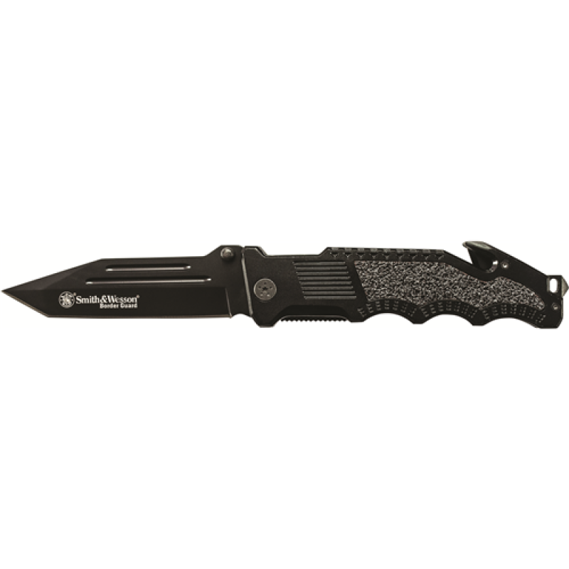 The Smith & Wesson Border Guard Knife, model SWBG2T, features a black tanto point blade. This big and beefy manual folder is designed for heavy duty cutting. Built with a 4.4 blade with a black tactical coat, the blade is ready to do some serious cutting. The blade has dual thumb studs and is wicked sharp right out of the box. The handle is heavy duty aluminum with steel liners. The handle features a window breaker at the base and a strap cutter on the spine which makes it a great tool for anyone.