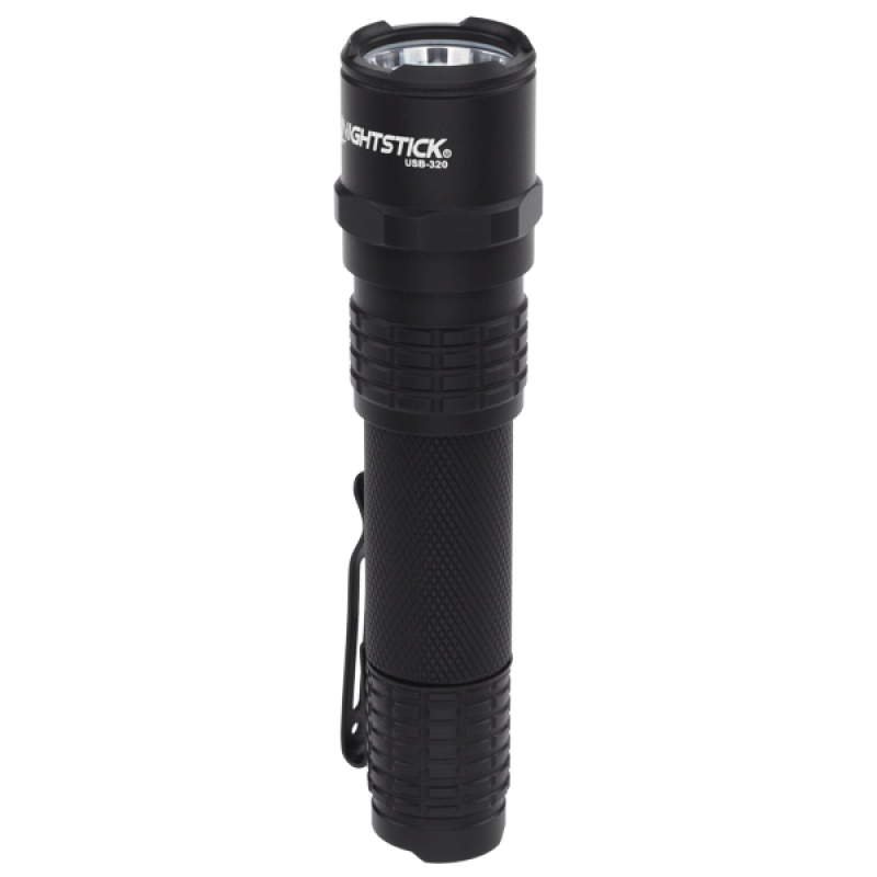 The USB-320 USB Rechargeable Every-Day-Carry (EDC) metal flashlight uses a CREE LED rated at 320 lumens for 1.5 hours. At only 4.5 inches long and weighing only 3 oz, this compact flashlight includes a removeable deep concealment clip for ease of use in and out of a pocket. With both momentary or constant-on functionality, the USB-320 features an IP-X7 rated waterproof housing with sleeved collar that discretely opens for direct USB charging turning from red to green when fully charged. Meeting the requirements of NFPA-1971-8.6 (2013), the USB-320 is also chemical, heat and impact resistant, and includes a 2 foot USB charging cable and lithium-ion rechargeable battery.