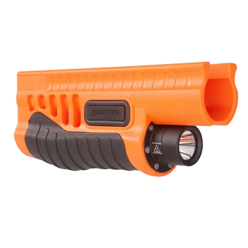 The SFL-12WL shotgun forend weapon light in less-lethal orange is a complete forend replacement for your 12 gauge Mossberg 500/590/590A1 or Shockwave pump-action shotgun. Built from a one-piece body of heavy-duty glass-filled nylon with an over-molded rubber grip area, it features a super-bright LED rated at 1200 lumens with an hour and a half runtime. Designed around a high-efficiency deep parabolic reflector, the tightly focused beam has a 203-meter beam distance. The SFL forend features ambidextrous switches positioned intuitively towards the front for easy activation. Both buttons are surrounded by a small raised bump guard that helps prevent accidental activation while racking the action or laying it on its side. The light also features an ergonomic palm swell design to improve grip during light activation and weapon manipulation under stress. Each SFL comes with an optional hand stop/safety strap and Nightstick's SFL action tube nut wrench for removal of factory-installed castle nut and pump handle fore-end. Comes with two CR123 batteries, but can be upgraded to li-ion rechargeable with optional 18650-KIT. Limited lifetime warranty.