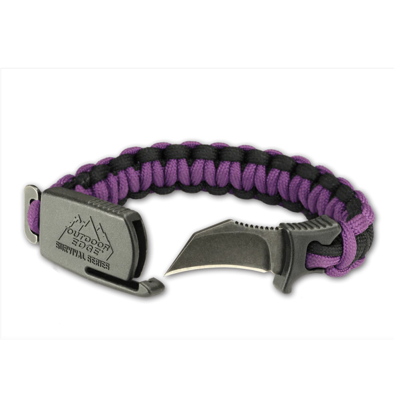 features a 1.5 inch hawkbill blade ground from 8Cr13MoV stainless steel with a stealthy BlackStone® finish. The blade is integrally molded to a glass/nylon guard that ties into the bracelet. Handle grooves and jimping on the thumb ramp ensure a positive grip at all times. The patent pending sheath system locks the knife securely for immediate deployment in any situation. Once deployed, the paracord bracelet forms the knife handle. Each bracelet is hand-tied from paracord and is available in three sizes and colors, each with an adjustable loop to fine tune the fit plus a steel T-post for easy attachment.