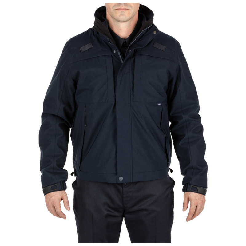 Compromise is not an option when lives and safety are on the line. Professionals need the best when working in the worst weather and conditions. That's why we've introduced our 5-in-1 Jacket 2.0. It's 8% lighter than its predecessor and much more flexible thanks to an outer shell of mechanical stretch polyester. The fully seam-sealed 10K waterproof and 10K breathable fabric with DWR provides Blood Borne Pathogen resistance. When it's pouring, cover up with the removable hood that can be rolled into the collar or stored in back pocket. A new Quixip system on the sides offers enhanced ventilation and rapid firearm access. The two-piece setup's removable interior liner features zip-off sleeves and a side zipper to provide even more versatility. Tech fleece construction ensures years of service and, when coupled with the shock cord at the hem, keeps warmth in. Add a pair of document pockets on both layers, and you have the 5.11 answer to tough situations.