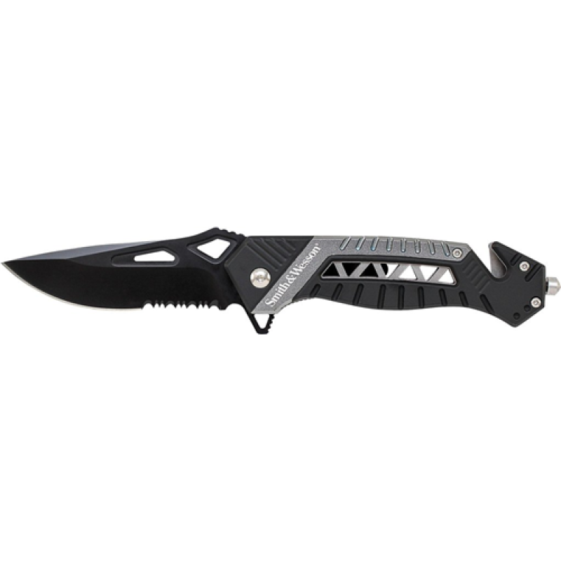 The SW608BLS tactical/rescue liner lock folder is an affordable knife with great utility. The 3.4 combo blade is forged from 8Cr13MoV stainless steel and is deployed via the flipper or the dual thumb studs. The blue/black aluminum handles feature a strap cutter, a glass breaker, and a tip-down pocket clip. The SW608 is available in silver, blue, and orange.