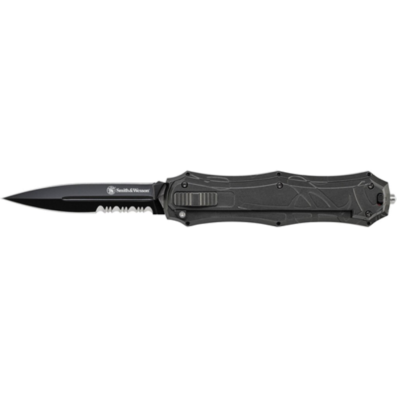 The SWOTF9B is an assisted opening OTF knife from Smith & Wesson and the knife is super fast and well made. It has a safety and a tab on the side used to retract the blade in addition to the thumb slide. The mechanism takes a little getting used to, but it truly is an awesome and impressive knife. Built with tactical intent in mind, the SWOTF9B has a slender profile and a tactical black finish. The AUS8 stainless steel blade is 3.6 long and forged into a double edge dagger, very reminiscent of a Benchmade or Microtech OTF Automatic. The aluminum handles are contoured for a better grip and include a glass breaker pommel, a pocket clip, and a safety lock.