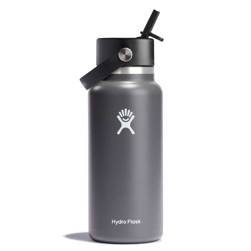 A 32 oz Wide Mouth water bottle with our leakproof Flex Straw Cap”easy to fill, easy to drink. Open it up, add your ice, and flip to sip. The insulated stainless steel keeps it cold for up to 24 hours.